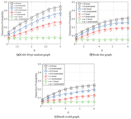 Detection Probabilities (true and estimated parameter) for Synthetic Graphs ((a) ER random graph, (b) Scale Free graph, and (c) Small World graph ().