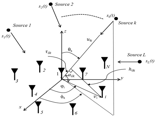 For generality, a 3D arbitrary antenna array geometry consisting of M elements is adopted and used to model the AoA estimation problem. L sources are assumed located in the far-field and sending L narrowband signals, which incident on this array from different elevation angles (θj) and azimuth angles (ϕj) incident, as shown in Figure 1. The incident signals are measured by the M sensors and then down-converted to the baseband level in order to process them digitally and finding the AoAs of the incoming signals. The vector of the received data, including the additive noise, is described below.