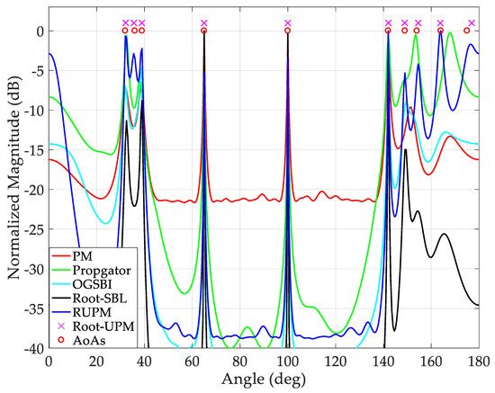 A numerical scenario was implemented with different incident AoAs to illustrate the principles developed. A ULA consisting of M = 32 with d = 0.5λ was considered and used to receive ten narrowband signals (L = 10) from sources located in the far-field. The number of measurements that assumed to construct the CM was set as N = 100 and SNR at the array output was set at 10 dB. The searching step angle is 0.5°. The directions of the ten plane waves are = [32° 36° 39° 65° 100° 142° 149° 154° 164° 175°] and indicated by red circles. Three of the received signals were postulated to be incident at closely similar angles = {32° 36° 39°}, in order to investigate the ability to resolve and detect directions of signals under this circumstance. In addition, five signals are incident at angles widely distant from the broadside direction, = {142° 149° 154° 164° 175°}, some of them close to each other. The RUPM and Root-UPM methods in addition to four other different AoA techniques, are considered here and used to estimate the directions of the incident signals. The reduction projection matrix parameter of the RUPM method is set to G = 5. For the OGSBI, For the Root-SBL and OGSBI methods, the maximum number of iterations and the tolerance error are set at 200 and 0.001, respectively, while the other simulation parameters are set as same as those presented in [28,45]. The performance comparison of these algorithms is illustrated in Figure 5.
