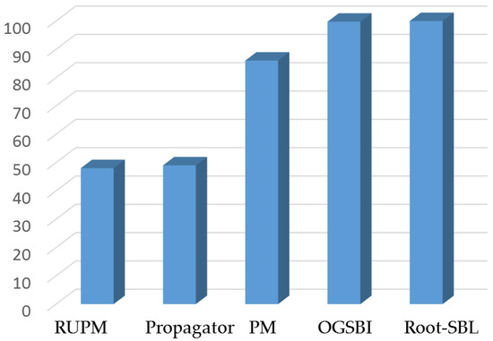 To compute the percentage of the reduce execution time using the Root-UPM compared to the RUPM, propagator, PM, OGSBI and Root-SBL methods, one can substitute the running time of these methods (see Table 2) in the tcomp separately to obtain this percentage. The reduced execution time percentage of the Root-UPM method compared to other techniques is shown in Figure 6.