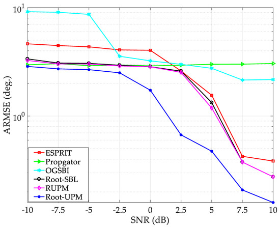 The SNR represents the ratio of the received signals power to the power of the additive noise (i.e., ) and this ratio plays an essential role in the performance estimation of the AoA method. Thus, the impact of the SNR on the estimation accuracy is tested and compared by assuming the SNR varies from −10 dB to 10 dB in 2.5 dB increments. Ten plane waves (L = 10) from different directions postulated as incident on a ULA consisting of M = 32 sensors with d = 0.5λ. One hundred snapshots were considered and used to construct the received data matrix. The same angles of arrival that assumed in Section 5.1 are applied in this scenario for all techniques equally to ensure a fair comparison. The ARMSE for each SNR was computed and then plotted, as shown in Figure 7. As depicted, the proposed methods (i.e., RUPM and Root-UPM) gives a better estimation resolution compared to other AoA techniques. It can be observed that the Root-UPM gives the best estimation accuracy among the compared methods through the whole the tested SNR range with the least computational burden as justified in Section 5.2. The performance of the RUPM is better than OGSBI, propagator and ESPRIT algorithms and comparable to the Root-SBL approach. However, the complexity and the execution time of the RUPM is much less than Root-SBL method as verified in Section 5.2.