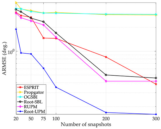 The last scenario compares the effect of the performance of the RUPM and Root-UPM methods with four popular AoA techniques based on different numbers of snapshots. Seven different numbers of snapshots were used: N = (20, 30, 50, 75, 100, 200, 300). The other simulation parameters were set to be the same as those given in Section 5.2 except that the SNR was set at 5 dB. The ARMSE of each method was computed and then plotted, as shown in Figure 8. It is clear that the proposed methods present better estimation accuracy over the simulated range of snapshot numbers, in comparison with the other methods. The Root-UPM provides the best estimation resolution compared to the simulated methods through the whole testing range. Furthermore, the RUPM approach gives approximately better direction estimation accuracy than the ESPRIT and Root-SBL techniques with significant improvements compared to the propagator and OGSBI algorithms.