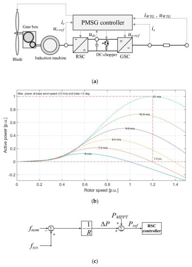 The PMSG model. (a) Typical configuration of a PMSG; Vr, Ir: voltage and current in the rotor circuit; Vt, It: voltage and current at the terminal; Vr,ref, Vt,ref: reference RSC and GSC voltage; VDC: DC-link voltage; Vg, Ig: voltage and current at the point of common coupling (PCC); ωr: rotor speed; β: pitch angle. (b) Operational characteristics of a PMSG. (c) Operational characteristics of a frequency stabilization scheme.