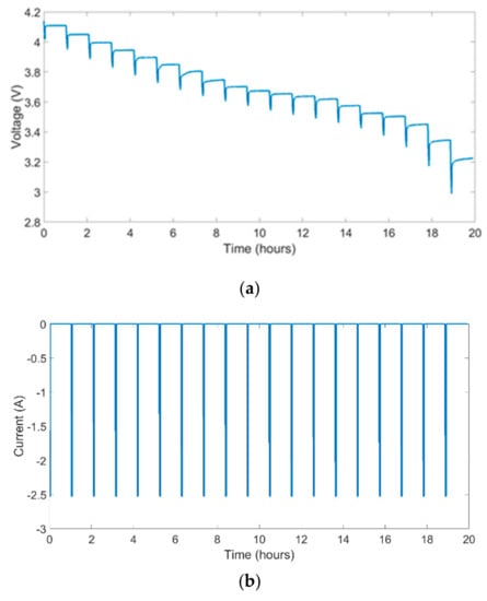 Pulse discharge in 5% increments of the SOC. (a) Experimental data of open circuit voltage. (b) Experimental data of discharged current.