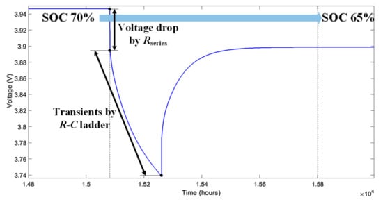 The pulse type tests cause the circuit dynamics of battery, which can provide necessary data about the performance of the battery cell at different points of the SOC. Figure 4 shows one pulse of the discharge test. To estimate Rseries, the voltage drops and rated current were used, which can be represented as:
