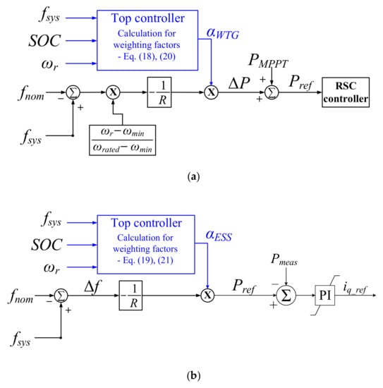 The weighting factors calculated using the coordinated control were multiplied and converted to the conventional frequency stabilization scheme as shown in Figure 6. Figure 6a shows the operational characteristics of a WTG; to support the frequency stabilization, the additional reference power, ΔP, was calculated and added to the reference of the MPPT control. When the frequency fluctuated, ΔP was calculated using the multiplication of the inverse of the system frequency and weighting factor according to the releasable and absorbable energy. The reference active power of ESS was calculated using the droop loop multiplied by a weighting factor. Thus, the WTG and ESS could contribute to the frequency stabilization and also adequately utilize the stored energy by sharing their releasable and absorbable energies.