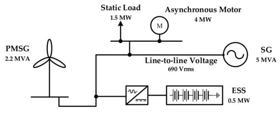 The isolated microgrid was modeled to investigate the performance of the coordinated frequency stabilization scheme. It was simulated using MATLAB Simulink Electrical simulator. The model system consisted of the static load, asynchronous motor, ESS, diesel generator, and PMSG, and they were connected in parallel, as shown in Figure 7. Furthermore, the initial values of the microgrid are shown in Table 1. In the Appendix, the parameters that affected the dynamics of the model system are explained, namely the parameters of the asynchronous motor and diesel generator. In this study, the system frequency was computed using zero crossing detection []. The WTG and ESS had a droop loop to allow them to aid in the stabilization of the system frequency (see Figure 1c). In this model, the wind power penetration level, which is defined as the capacity of wind power divided by the peak load, was calculated to be 40.0%.