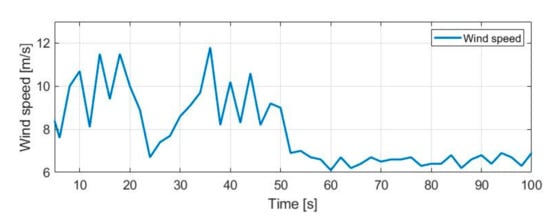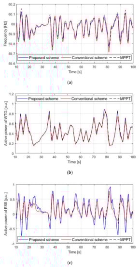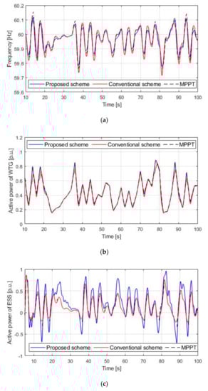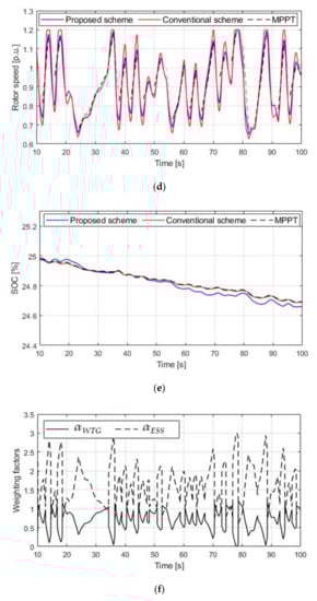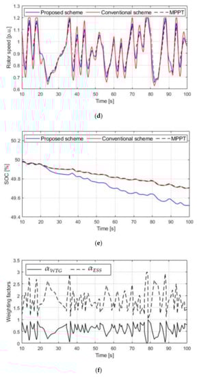 In this case, the initial SOC of the ESS was set at 50% and both the WTG and ESS supported the system frequency stabilization. Figure 8 shows the wind speed variation profile, and based on the fluctuation of the output power of a WTG from wind speed variation, the system frequency fluctuated. Figure 9 shows the simulation results, including the effects of the wind speed variation. The frequency deviation for the proposed scheme was less than that of the conventional scheme. The peak-to-peak of the system frequency for the MPPT, conventional scheme, and proposed scheme were 0.3930 Hz, 0.3966 Hz, and 0.3404 Hz, respectively. This was because the coordinated control arbitrated the releasable and absorbable energy of WTG and ESS; thus, in the results for the proposed scheme, the active power of the ESS was released more in line with the conventional scheme (see Figure 9c). The active power of the WTG rapidly reduced as the wind speed significantly decreased between 80.0 s and 82.0 s. The system frequency decreased to 59.71 Hz for the conventional scheme, and the decrease was less than that of the proposed scheme by 0.063 Hz. This was because the output power of a WTG in the conventional scheme was abruptly reduced and the output of an ESS could not easily and rapidly compensate for the decrease whereas the stored kinetic energy of the WTG was significantly released. However, the proposed scheme determined the weighting factors by considering their releasable and absorbable energy. The sudden decrease in wind power output due to wind speed decrease resulted in a decrease in releasable energy. Thus, αWTG decreased, whereas αESS increased; accordingly, ESS could compensate for the reduced output power of the WTG by releasing its electrical energy.