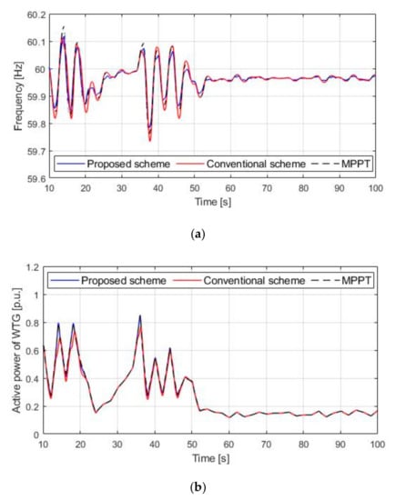 The performance of the frequency stabilization control of a WTG is affected by the system frequency, which depends on the balance between supply power and demand power. Thus, we investigated the performance of the frequency stabilization schemes under various wind speeds. In addition, the proposed scheme had a positive performance, even in cases where the wind speed was kept very low. Furthermore, in the case of load variations, the performance of the proposed scheme was verified.
