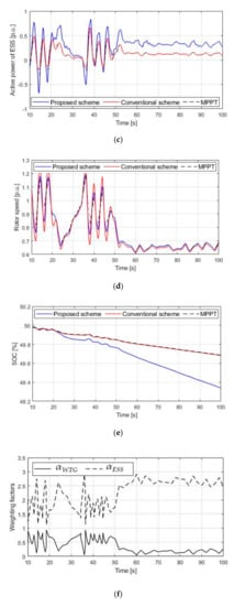 The reduced amount of SOC for the conventional and proposed schemes were 0.2984% and 0.4802%, respectively (see Figure 9e). Because the coordinated control increased the additional active power using weighting factors related to SOC, the weighting factors of the WTG and ESS were calculated for the releasable and absorbable energy. In this case, the ESS had enough releasable and absorbable energy, and thus, αESS was determined such that the ESS had a greater contribution compared to the WTG, as shown in Figure 8f. Note that the high value of coefficient p could adversely affect the frequency stabilization when the penetration level of the WTG was high.