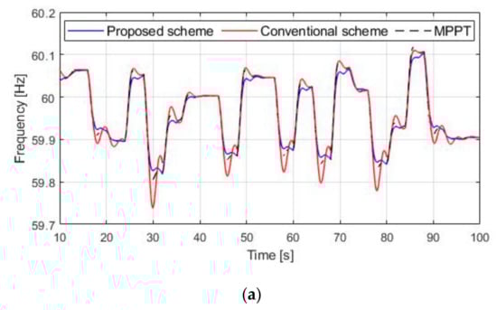 Figure 14e shows the SOC of the ESS. The reduced amount of SOC for the proposed scheme and conventional scheme were 0.4225% and 0.2731%, respectively. In the proposed scheme, the WTG had a lower contribution to frequency stabilization than in the conventional scheme. Thus, the contribution of the ESS was increased to perform the frequency stabilization, as shown in Figure 14f. As a result, the frequency stabilization control was performed stably by preventing an excessive contribution toward the frequency stabilization by the WTG.