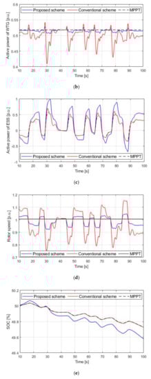 The results for case 2 are presented in Figure 10. In this case, the initial SOC was set at 25% and was less than that of case 1. The peak-to-peak of the system frequency for the proposed scheme was 0.3556 Hz, which was less than in the MPPT by 0.0365 Hz, and less than in the conventional scheme by 0.0405 Hz. When the frequency deviation was smaller than zero, WTG and ESS increased their output powers. However, the results of the peak-to-peak of the system frequency for the proposed scheme was greater than in case 1. This was because the releasable energy of not only the ESS, but also the WTG, was smaller than in case 1. However, in situations where the energy was absorbed, the active power of the ESS was larger than that of case 1 (see Figure 10c), since the initial SOC was set at a low value. Thus, the reduced amount of SOC for the proposed scheme was 0.3411% (see Figure 10e), lower than that of the proposed scheme in case 1 by 0.1391%.