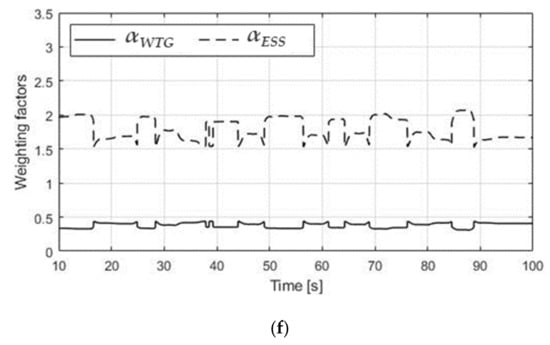 Figure 10f shows the weighting factors of the coordinated control, and because of the low SOC, αWTG was determined for a high value in comparison to the results for case 1 when the frequency deviation was lower than zero. Thus, the WTG released more kinetic energy stored in the rotor; accordingly, wr slightly decreased (see Figure 10d). In addition, the determined αESS was lower in comparison to the results in case 1. Hence, the released energy of the ESS decreased and the absorbed energy increased in comparison to the results in case 1.