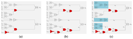 Logic cone analysis based attack and hill-climbing attack evolved from path sensitization attack. Therefore, one design can withstand logic cone analysis based attack and hill-climbing attack with modifications on the basis of resisting path sensitization attack. Path sensitization attack can crack the keys of logic encryption through selecting the appropriate input vectors and the comparison and analysis of the circuit output with the normal function of IC. The keys of key-gates can be cracked by observing outputs of both circuits if the designer does not take protective measures against these keys of key-gates. Consider the circuit shown in Figure 3a. Assume the outputs of the gates G14, G15, and G10 have been selected as the inserted key-gates’ locations. Figure 3b shows the encryption circuit for inserting the key-gates into the determined locations. The keys of logic encryption, including K1, K2, and K3, can be cracked through path sensitization attack. The attackers utilize the input of the circuit to control n1 of G16 to crack the key K1 through observing the output O1 of G16. The inputs of the circuit can be set to 1001xxxxxxxxxxx, n1 set to one as the wire, and n1 is determined by I1, I2, I3, and I4, as shown in Figure 3c. Similarly, the output of G13 makes the key-gate KG2 sensitive through setting the wire n2 to one. The inputs of circuit can be set to xxxxxxxx00xxxxx and the wire n2 set to one as the wire n2 is determined by I9 and I10. Based on the above process, the attackers can crack the key-inputs. After cracking the key-input K2, the key-input K3 can also be cracked through setting the input of circuit xxxxxxxxxx0011x, as the wire n5 is determined by inputs I11, I12, I13, and I14.