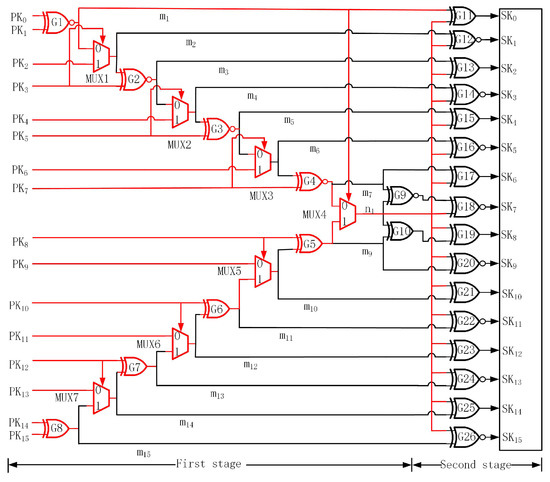 The whole block is composed of XOR, XNOR, and multiplexers that are connected to each other, which greatly increases the correlation of the block inputs. The block of proposed key interdependency can be divided into two parts that are adjacent to each other. The first part of the top is comprised of XNOR and multiplexers. The bottom is comprised of XOR and multiplexers. To increase high interference among the keys, the n1 wire will be generated. As shown in Figure 4, represents the primary key and represents the secondary key. For the n1 wire, it is associated with all primary keys. When any primary input changes, the value of n1 will change accordingly and affect the 16 key-gates, which is exhibited utilizing red wires in Figure 4. The second stage is comprised of XNOR and XOR gates. The reason for choosing XOR/XNOR in the second stage is that it is more difficult for the attackers to analyze the key-gates, because either XOR or XNOR is used as the key-gates of logic encryption, which increases the confusion of the attackers. From the functional perspective of XOR/XNOR, the output of XOR/XNOR depends on multiple inputs, which leads to a higher correlation between inputs and outputs.