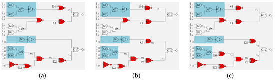 Preventing path sensitization attack. (a) Modified (K1) circuit. (b) Modified (K2) circuit. (c) Modified (K3) circuit.