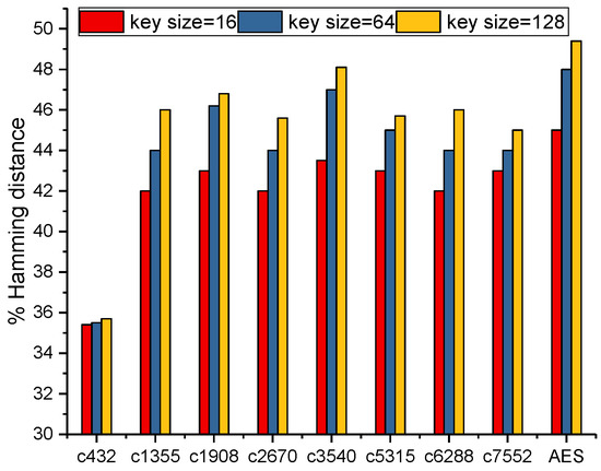 After the rare nodes were identified, the key interdependency block was merged and connected with the netlist, and the key-gates were inserted utilizing the enhanced method. The secondary keys, which were generated through the key interdependency block, were directly connected to the key-gates. A set of 1000 wrong keys were randomly provided to the encrypted netlist, and output corruption between the observed outputs and the correct outputs was analysis. Figure 6 exhibits the Hamming distances when the wrong keys were applied to the netlist. The Hamming distance for the circuits (except c432) were within 46% to 50%, when encrypted with 128 bit keys. For those smaller circuits, like c432 with only 120 gates, their input and output numbers were very small (only 43), and the number of rare nodes was also very small (only 9). Therefore, whether the key size was 16 bit, 64 bit, or 128 bit, when the key changed, the Hamming distance of the c432 circuit would hardly change (approximately 34%). The 64 bit keys could produce up to 44% to 46%, while the corruption was approximately 42% to 45% for 16 bit keys. In [15], the output corruption with 128 bit keys reached 45% to 50%. The output corruption with 64 bit keys reached 38% to 44%, while the output corruption with 96 bit keys was approximately 42% to 47%. Compared to [15], the output corruption through our method improved the percentage of the output corruption by 5% for 64 bit keys.