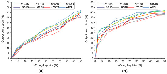 As mentioned previously, hill-climbing attack and logic cone analysis attack were evolved from path sensitization attack. The essence of the above three attack methods is the same for cracking the keys of logic encryption. To estimate the resistance of the enhanced logic encryption against the above attacks, the Hamming distance between the observed and the correct output was calculated to evaluate the validity of resisting the above attacks. Whether these three attacks could successfully crack the keys of logic encryption was closely related to the number of wrong keys. The number of wrong keys was gradually decreased, and the difference was analyzed based on Hamming distance with rare node analysis without the key interdependency block and rare node analysis with the key interdependency block. Figure 7 shows the output corruption percentage between the rare node analysis method without and with the key interdependency block with 128 bit primary keys for the wrong key bit percentage for ISCAS’85 benchmarks [22] and the AES circuit. The percentage of the output corruption characterized the Hamming distance between the observed and the correct output. When the percentage of wrong primary key bits decreased, the consequent percentage of the output corruption also decreased without the key interdependency block. The percentage of the output corruption and the percentage of wrong key bits formed an approximate linear dependence, which could help the attackers crack the keys of logic encryption. However, as the percentage of wrong primary key bits in the key interdependency block decreased, the percentage of corrupted output did not decrease dramatically. The output corruption for 2% wrong primary key bits was 15% to 25%, while for the same number of wrong primary key bits, the logic encryption without key interdependency block produced 2% to 5% of output corruption. Furthermore, the output corruption reached 40% for wrong primary key bits with the key interdependency block, while 45% for wrong primary key bits without the key interdependency block. This was because the key interdependency block interfered with the keys greatly. Thus, attackers did not converge to correct keys. In the key interdependency block, the wrong bit of primary key pushed all secondary keys, which made it more difficult for attackers to crack the keys of logic encryption. The proposed logic encryption with the key interdependency block, which produced high output corruption, limited the cracking of the keys of logic encryption utilizing attacks based on the path sensitization attack.
