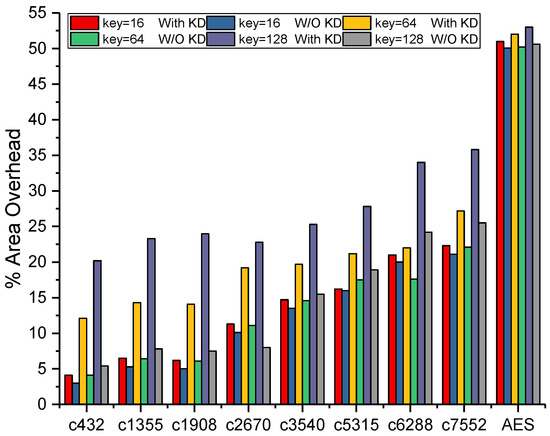 In our experiment, the 16 bit, 64 bit, and 128 bit key interdependency blocks were integrated with the circuits, and the area overhead of the enhanced logic encryption was evaluated. Figure 8 shows the area overhead for different key sizes with and without key interdependency blocks in ISCAS’85 benchmarks, respectively. In Figure 8, the tags with “key = 16 with KD”, “key = 64 with KD”, and “key = 128 with KD” represent the area overhead of the enhanced logic encryption for 16 bit, 64 bit, and 128 bit key interdependency blocks, respectively. In order to show the proportion of the area overhead of key interdependency blocks in the circuit, the logic encryption method without the key interdependency block was designed [1,5,26]. The tags “key = 16 W/O KD”, “key = 64 W/O KD”, and “key = 128 W/O KD” in Figure 8 represent the area overhead of the logic encryption method without the key interdependency block for 16 bit, 64 bit, and 128 bit key interdependency blocks, respectively. The area overhead of the key interdependency blocks for different key bits in the same circuit was different, and the area overhead of the key interdependency blocks for the same key bits in various scale circuits also varied. For small sized circuits, like c432, c1355, c1908, and c2670 with less than 1k gates, the area overhead increased approximately 15% for 128 bit keys, while 10% for 64 bit keys and 3% for 16 bit keys. Still, for larger sized circuits, like c3540, c5315, c6288, and c7552 with more than 1k gates but less than 3k gates, the area overhead of 128 bit keys was 10%, while 5% for 64 bit keys and scarcely increasing for 16 bit keys. Furthermore, for the AES circuit, which had around 50k gates, the area overhead of 128 bit keys was 4%, while hardly increasing for 64 bit keys and 16 bit keys. Thus, the enhanced logic encryption method could protect these circuits at the expense of reasonable area overhead through selecting different key-sizes. Circuits (c432, c1355, c1908, and c2670) should utilize 16 bit keys to guarantee that the percentage of area overhead is under 3%. Circuits (c3540, c5315, c6288, and c7552) should utilize 64 bit keys to guarantee that the percentage is under 5%. The AES circuit should utilize 128 bit keys to guarantee the percentage under 10%.