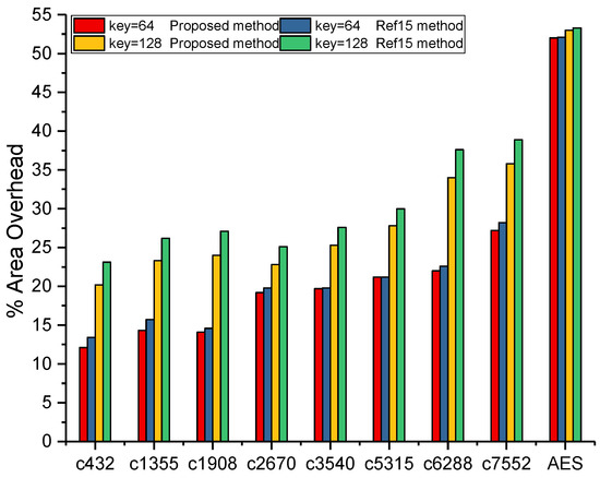 A comparison analysis was performed with the results in [15], and Figure 9 shows a comparison of the area overhead of the proposed method and [15] when the key-size was 64 bit and 128 bit, respectively. The area overhead of the proposed key interdependency block for small sized circuits, like c432, c1355, c1908, c2670, c2670, c3540, c5315, c6288, and c7552 with less than 3k gates, was approximately 3% less than that of [15] when the key-size was 64 bit, while approximately 5% less for the 128 bit keys. However, for larger sized circuits, like the AES circuit with around 50k gates, the area overheads of the proposed method and [15] were almost the same. Therefore, the area overhead was acceptable for the different circuits through selecting different key-sizes.