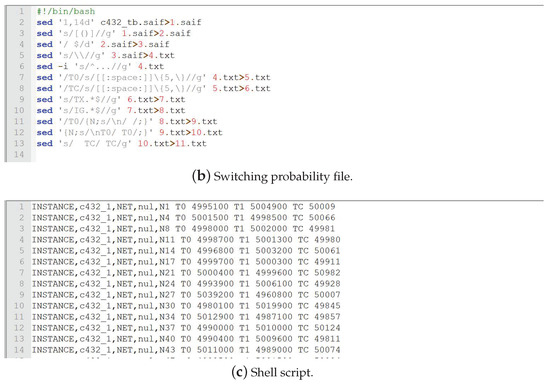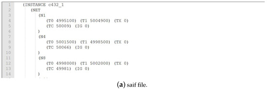An illustrative minimum working example (MWE) is demonstrated with details in the process of carrying out experiment on benchmark c432. Overall, the whole flow of our framework first synthesized the circuit into the gate level netlist, then the information was extracted from the files utilizing automatic scripts, and the results were calculated based on the data. The benchmarks utilized in this paper were developed in register-transfer level (RTL) code, and the Design Compiler (DC, Version 2010.03-SP5-2) was utilized to synthesis the RTL code into the gate level netlist. After the gate level netlist was available, Verilog Compiler Simulator (VCS, Version 2010-06) was utilized to carry out gate level simulation with random stimuli. The Switching Activity Interchange Format (*.saif) file was utilized to log the node switching probabilities, then a shell script (saif_data.sh) was used to rand the probabilities from low to high. With the pre-set threshold (refer to Section 3.2), the rare nodes with low switching probabilities were sorted out, and the nodes together with their corresponding switching probabilities were saved in *.txt format files. Note that the nodes with no switching probabilities were removed because these nodes were usually connected directly to VDD or GND in the circuit. The above mentioned intermediate files are illustrated as fragments in Figure 10. With the consideration that the whole process was handled utilizing automatic scripts, our method should have good scalability ability, but the processing time may be long. For future work, we will validate our framework on big ICs with millions of gates.