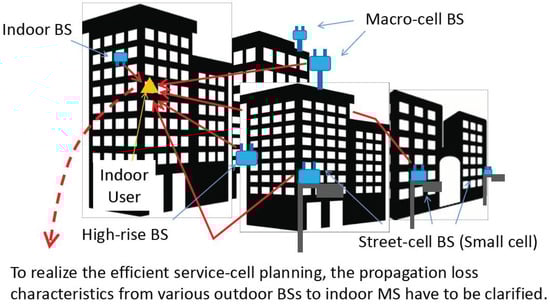 Owing to the widespread use of various application services such as video streaming and cloud services, which are accompanied by the advancement of mobile terminals, user traffic in cellular networks is rapidly increasing. Thus, for efficient radio resource usage, service-cell planning is an important issue. In particular, cell planning becomes complex in urban areas because many users are also inside high buildings, which are sometimes higher than the base stations (BSs) as shown in Figure 1. Therefore, three-dimensional (3D) service-cell planning is considered in those areas [].