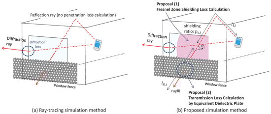 In this paper, we propose the extension method of the ray-tracing simulation to take those effects into the penetration loss calculation. In our proposal, we don’t require the fine 3D environment model for the simulation because there is another difficulty to obtaining accurate models in real environments. Because the very detailed electromagnetic simulation has a high calculation cost and it is not suitable for the service-cell planning, we used the simplified calculation method from the simplified model. The difference between the existing ray-tracing simulation and the proposed method is shown in Figure 2. The proposed method consists of the Fresnel zone shielding loss calculation and the transmission loss calculation by equivalent dielectric plate. In the proposed method, normal ray-tracing simulation was calculated firstly, and the trajectory of each ray was investigated. Next, the Fresnel zone shielding loss  and the transmission loss by appurtenances  of ray i were calculated, and those additional losses were added to the electric field strength  and pathgain  calculation in (1) and (2).
