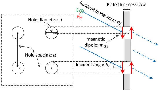 Many appurtenances such as window blinds and window fences are often attached around the window, and they are thought to affect the penetration loss characteristics. However, the calculation of those effects is not straightforward, because their shapes are thought to be a kind of screen but they have a complicated structure in detail, which is quite different from the plane surface that the ray-tracing simulation assumes. Therefore, the calculation method needed to deal with the effect of the structure in the ray-tracing based simulation. In this paper, we assumed that those screen structures were able to be modeled by the metal plates with periodically perforated small holes, and we calculate the transmission loss by regarding the plate as an equivalent dielectric plate [,] based on the theory of diffraction by small holes [,]. The calculation model is shown in Figure 3. it is assumed that small round holes are periodically perforated in the metal plate.  is the thickness of the plate, and the hole spacing a and the hole diameter d are thought to be enough smaller than the carrier wave wavelength . We consider that the transverse electric (TE) wave arrives from the incident angle . In the case, it was thought that the magnetic dipole  was induced on each small circular hole by the incident magnetic field .