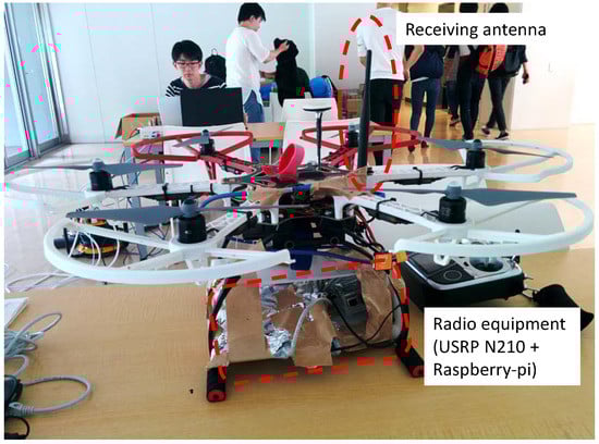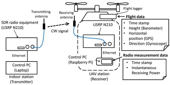 The diagram of the developed radio propagation measurement system is shown in Figure 4. The radio transceiver was implemented on a universal software radio peripheral (USRP) N210 [], which is one of the commercial SDR platforms. In the measurement, the Tx was set indoors, and the Rx was mounted on the UAV. These were regarded as the indoor MS and virtual outdoor BS, respectively. The Tx-side USRP was controlled by a laptop personal computer (PC) and sends the continuous wave (CW) signal. The Rx recorded the instantaneous narrowband receiving power continuously during the measurement. The Rx-side USRP was controlled by Raspberry Pi [], which was a single-board computer to reduce the payload. The photograph of the UAV station is shown in Figure 5. The total payload was less than 1 kg, and it could be operated using the portable battery of the UAV. The total dimensions of the system including the UAV were less than 60 cm × 60 cm × 50 cm, and it was usable for various BS placements in various measurement environments. Since the flight course of the UAV was not correctly controlled as planned because of natural disturbances such as wind conditions, it is crucial to know its actual flight trajectory for the data analysis. The UAV also recorded several sensor outputs as the flight data. We calculated the UAV height from the barometer data, the horizontal position from the GPS data, and the direction from the gyroscope data. Since the measurement and flight data were associated with the time stamp information, it was possible to trace the 3D position of the UAV and obtain the receiving power at each position by the post data processing.