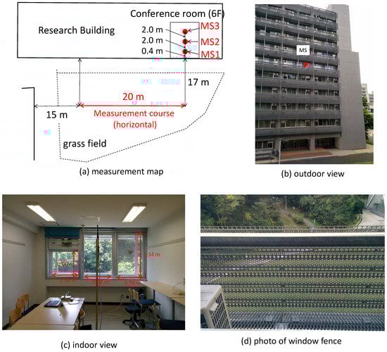 Measurement overview ((a) measurement map, (b) outdoor view, (c) indoor view, and (d) window fence).