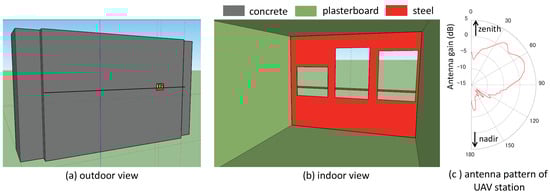Raplab software [] was used for the ray-tracing engine. In the simulation, the method of imaging algorithm [] was used, and the maximum number of reflections was three, the maximum number of diffractions was one, and the maximum number of transmissions was one. Dipole antennas were applied on both the BS and MS sides. Although the theoretical radiation pattern was used for the indoor MS, the measured pattern was used for the outdoor BS to consider the influence of the UAV frame on the pattern. The elevation radiation pattern of BS measured in an anechoic chamber is shown in Figure 7c. Because the pattern had an upward trend owing to the UAV frame effect, it is thought that the contribution of the reflection waves from the ground was not significant in the measurement. Therefore, the ground reflection waves were not calculated in this simulation.