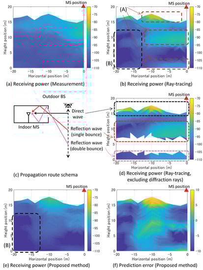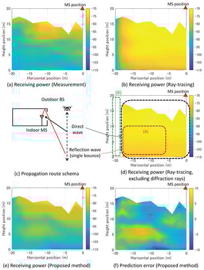 The same analysis was performed for the MS3 setting. The measurement result and the ray-tracing simulation result are shown in Figure 9a,b. In the simulation, the receiving power was overestimated in the area marked (A) while it was underestimated in the area marked (B). The reason for these discrepancies was analyzed in Figure 9c,d. Because the distance between the indoor MS and the window increased, most of the BS positions were under the non-Line-of-Sight (NLoS) condition. Therefore, the single and double bounce reflections became a more dominant propagation mechanism. By comparing Figure 9a,d, it can be seen that area (A) corresponded to the area that direct and reflection waves were observed like the MS1 setting. No direct and reflection waves were observed when the BS height was about 5 m, and the diffraction waves were dominant in the area. Especially, the receiving power reduced in area (B) because multiple losses owing to the reflections and the diffractions occurred. On the whole, in the ray-tracing simulation, the diffraction waves were tended to be estimated weaker than the measurements. This problem might be because of the issue of the ray-tracing simulation itself or because of the accuracy of the environment model such as the detailed structures and material parameters of the interactive objects. Further detailed analysis will be future work. In the receiving power prediction of the proposed method shown in Figure 9e, the overestimation issue of the receiving power in the area (A) was fairly corrected. However, the underestimation issue in the area (B) remained.