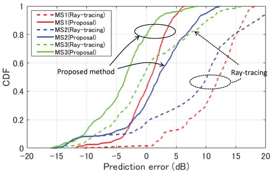 The prediction errors of the ray-tracing simulation and the proposed method are summarized in Figure 10. The data represent the prediction error CDF of all BS positions. The positive error means that the prediction result was higher than the measurement. The mean and the standard deviation of the error is summarized in Table 3. As described in the previous paragraphs, the ray-tracing simulation had the problem of underestimating the penetration loss. The mean errors were 11.1 dB and 8.0 dB in the MS1 and MS2 settings, respectively. Although the mean error was 0.4 dB in the MS3 setting, it does not mean the correct power was predicted. In actuality, the power of direct and reflecting waves was overestimated and the power of diffraction waves was underestimated, and they happened to balance in this environment. In the proposed method, the mean errors were improved to 0.3 dB and 1.5 dB in the BS1 and BS2 settings, respectively, while the error slightly increased in the BS3 setting because of the inaccuracy of diffraction loss estimation. However, the total prediction error was improved from 7.0 dB to −0.5 dB, and the result proved the effectiveness of the proposed method. About the dispersion of error, the standard deviation was also improved from 8.2 dB to 5.3 dB.