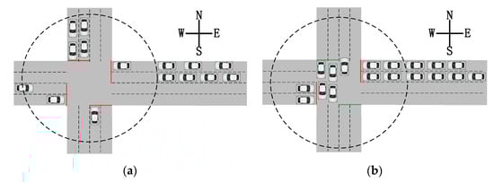 So far, in most of the scientific research and engineering applications, the traffic signal control system at the urban intersection generally collects the information of vehicles within the intersection area as the input data for modeling and calculation. The data can be easily acquired and then preliminarily analyzed using visual sensor devices at the intersection (e.g., cameras) and some corresponding image processing techniques. However, vehicles that have not entered the intersection area before the decision-making time may reach the intersection later, potentially impacting the effectiveness and accuracy of the decision. As shown in Figure 1, at time , based on the information of vehicles within the intersection area, the signal control system makes the decision to change to a green light for the north-south bidirectional traffic flows. At a later time , a large number of vehicles on the east side enter the intersection area and encounter the forbidden signal. They have to wait for the right-of-way, which results in an increase in overall delay time and a decline in traffic capacity at the intersection. Therefore, it is clear that the information of the vehicles in the non-intersection area (which we call far vehicles in this paper) is of great significance for the signal control decision.