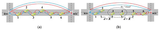 Collection of real-time vehicle information through a vehicular ad hoc network (VANET): (a) end-to-end connecting using multi-hops and (b) breaking by “island.” RSU: roadside unit.