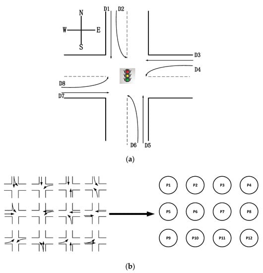Abstraction of signal phases at the intersection: (a) urban intersection diagram and (b) the 12 combinations of traffic flows.