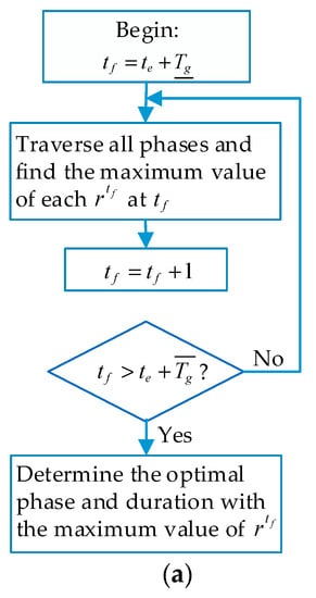 Figure 4 shows the decision-making process of our proposed dynamic phase and period signal control scheme. From to , is sequentially set per unit time to calculate the eliminable waiting time (, ) for all 12 combination phases, and the ratio of the eliminable time of each phase to the total waiting time of all phases () simultaneously according to: