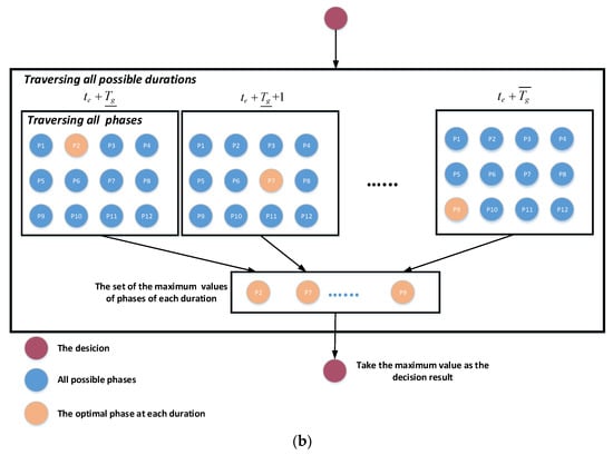 Process of decision-making for the combination phase and green light duration: (a) decision flowchart and (b) decision illustration.