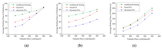 Figure 5 shows the average waiting time of vehicles under different traffic flow environments at the intersection. From the three graphs, it can be clearly seen that the waiting time increased with the increasing traffic volume. Under the environment with the same even traffic flows (Figure 5a), when the value of traffic flows was small, due to the estimation for the arrival time of each far vehicle and then the raising of the precision level in decision-making, the waiting time in the fixed-FA and dynamic-FA was obviously smaller than that in the traditional timing scheme; when the number of vehicles increased, the results of three schemes tended to be the same (especially around 87 s at 350 veh/lane/h), which was because all arrival traffic flows became equal and saturated, and then the regulating effect of the dynamic signal control dropped gradually and even disappeared regardless of whether the far vehicles were taken into account. Under the environment of same uneven traffic flows (Figure 5b), with the aid of predicting the arriving time of each far vehicle, the signal decision system could make the corresponding adjustment in advance for these uneven traffic flows. Furthermore, compared with the other two fixed-phase signal control schemes (i.e., with four phases), in the dynamic-FA, there were 12 possible combination phases that could provide more available options and enhance the adjustment capability. As a result, the waiting time of vehicles was reduced by averages of 51.4% and 37.8% compared with the traditional timing and fixed-FA schemes, respectively. When the volumes of some individual traffic flows were relatively larger than others (i.e., two times larger), as shown in Figure 5c, the set of values of the waiting time was overall greater than that with the same even traffic flows and the same uneven traffic flows. Moreover, since the signal combination phase and the green light duration were dynamically determined according to the real-time situation, the large traffic flows could be easily favored in the decision-making. Furthermore, with the raising of the accuracy supported by the information of far vehicles, the performance of the dynamic-FA scheme was clearly better than the other two schemes. In addition, Table 2 provides the information of confidence intervals with a 95% confidence level for the calculated average waiting time of the fixed-FA and dynamic-FA schemes when the traffic flow was 250 veh/lane/h.