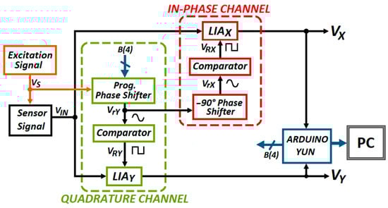 Note that this arrangement with an in-phase and an in-quadrature channel is equivalent to a dual phase LIA, which can recover both the magnitude and phase information, or equivalently the real (VX) and the imaginary part (VY), of electrical impedances [26]. Thus, the proposed system can be operated as single-phase LIA with automatic phase alignment, or as a dual phase LIA [26,27,28,30,31,32].