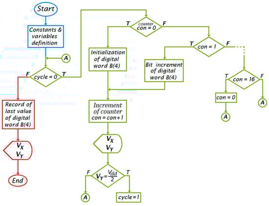 As for the programming, constants and variables for measurement and control are first defined, and inputs/outputs (I/O) are assigned. Next, the phase shift control word is initialized to B(4) = {1, 1, 1, 0} to set θVR = +90°, and the output of both channels is recorded. If phase alignment is needed, i.e., if VY ≠ Vdd/2, a cycle begins in which B(4) is initialized to {0, 0, 0, 0} and increased to adjust the phase shift provided by the PPS, until the quadrature condition is reached at the output of Q-Channel. Then, the system finishes the phase tuning step and the measurement process begins: with the last saved value of B(4), the data of IP and Q Channels (VX and VY) are recorded. The flow chart of the program is detailed in Figure 6.