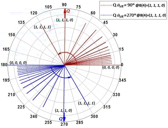 As already mentioned, there are two valid solutions to operate the single-phase LIA: with VIN and VRX in phase or in counter-phase, i.e., with a final phase shift between VIN and VRY of 90° or 270°. Figure 9 shows the phase adjustment steps in the Q-channel in both cases, starting with a 0 or 180° phase shift between VIN and VRY. Note that from 120° to 180° (300° to 360°), a 60° range of adjustment is lost. It is worth mentioning that this issue can be solved by increasing the number of bits or redesigning the R-2R ladder to obtain a smaller value of RPS. Even though it was not experimentally implemented, it was verified by simulation that the ideal RPS range of values for f0 = 1 kHz would be from 10 kΩ to 50 Ω to cover the entire phase adjustment range.