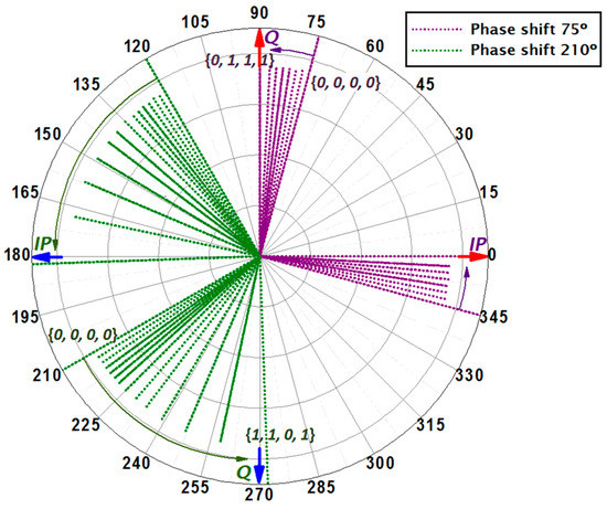 The steps in phase that the PPS circuit performs for both phase shifts in the Q-Channel, and how the IP-Channel follows the same steps but with a constant −90° shift, are shown in Figure 10, where it is verified that both channels are adjusted to operate in the required phase conditions.