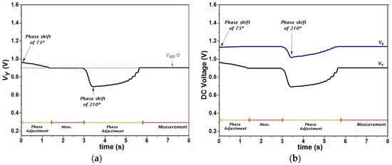 The VY output is displayed in Figure 11a. Considering the cut-off frequency of the LPF, during the calibration stage a delay of 120 ms was added at each digital bit change (b3-b0) to allow VX and VY to be properly established. When the quadrature condition is satisfied, i.e., VY = Vdd/2, the in-phase condition is set for the IP-Channel and the measurement procedure can begin. For this test, the phase adjustment and measurement processes were performed in periods of approximately 2 seconds each. During these same measurements, the VX voltage was also monitored as shown in Figure 11b, where the two outputs, VX and VY, for the cases of 75° and 210° phase shifts are presented. When VY = Vdd/2, the VX output shows the expected DC voltage (1.139 V with relative error εrV = 0.2%), meaning that VIN and VRX signals are in-phase.