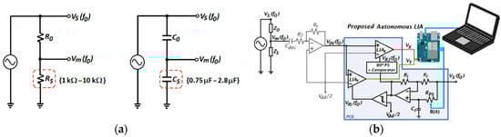 The measurement setup system is shown in Figure 12. Figure 12a shows the electrical symbol of the resistive and capacitive sensors with a tolerance of 2% and 5%, respectively, that were placed into a voltage divider and stimulated with a sinusoidal signal VS = 600 mV at 1 kHz, with reference resistor R0 = 5 kΩ and reference capacitor C0 = 1.6 µF, respectively. The sensors were previously measured independently to determine their real value, therefore, the estimated value of the resistive and capacitive sensors based on the measured voltages is compared with the exact value of the sensor. This way, the accuracy of the proposed LIA when determining the sensors values can be quantified.