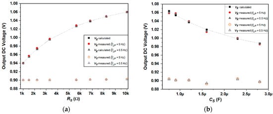 Figure 14 shows the RS and CS sensor values obtained from these equations. It can be observed in both cases that the use of a smaller cut-off frequency for the LPF results in higher measurement accuracy. For the first case (Figure 14a) the system presents a sensor measurement relative error εrS lower than 3%; for the second case (Figure 14b) the relative error εrS is below 5% in the determination of the capacitive value. The proposed system operating at maximum gain has a measurement sensitivity of 16.3 µV/Ω and 37 kV/Farad for resistive and capacitive sensor, respectively.