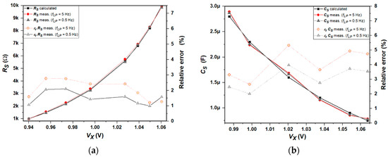 Sensor value recovery with relative error in function of VX output voltage: (a) resistive sensor; (b) capacitive sensor.