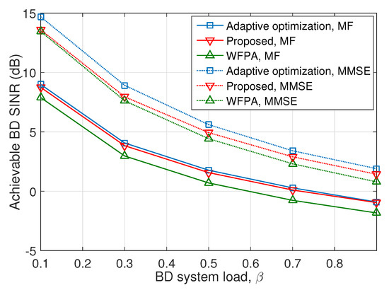 Achievable asymptotic BD signal-to-noise-plus-interference ratio (SINR) versus BD system load.