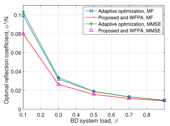 Figure 3 illustrates the reflection coefficient under different levels of . It indicates that for both MF and MMSE receivers, the reflection coefficient obtained by the proposed algorithm is lower than that achieved by the adaptive optimization. The gap is more obvious when the BD system load is small. This means that, compared with the adaptive optimization of reflection coefficient, although a degree of BD SINR is sacrificed, a smaller portion of reflection energy is needed with the proposed scheme. Thus, more energy of the incident signal can be reserved for prolonging the lifetime of the device or used for receiving signal to realize the tag writing [24]. On the other hand, we can see that the BD reflection coefficient achieved with the proposed scheme is equal to that achieved by the WFPA. This indicates that the proposed scheme can achieve higher BD data rate than the WFPA scheme by using the same level of reflection coefficient.