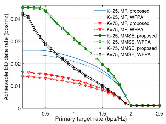 Finally, we observe the achievable BD data rate by varying the target rate of the primary transmission to illustrate the impact of the primary target rate on the AmBC system. Different numbers of BDs are considered, i.e., and 75, to represent the scenarios of light and heavy BD system load, respectively. From Figure 5, we can see that for both MF and MMSE cases, and for all levels of feasible , the proposed scheme can achieve higher BD data rate than the WFPA scheme. The gap is more obvious when MF is adopted. Specifically, for the MF receiver, the decreasing speed of the BD rate as the primary target rate increases is relatively small when is less than 1.5 bps/Hz. In contrast, for the MMSE receiver, the BD data rate can be increased quickly when the primary target rate decreases, especially with the larger number of BDs ().